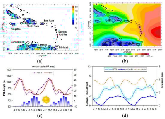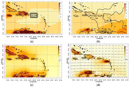 The Caribbean study area (Figure 1a) 10–24 °N, 79–54 °W extends from Trinidad to Cuba. Current information on country emissions and sector burdens were drawn from the Food and Agriculture Organization [] database, and fire emission data were obtained from the Global Fire Emissions Database (GFED) []. In-situ [] sun photometer data at Parguera, Puerto Rico, was considered and the daily aerosol optical depth fine fraction (AOD f/c) was extracted. After screening for deep clouds, the 2005–2015 sample size was 2880 days. Monthly Puerto Rico hospital respiratory case admissions were obtained from the Dept of Health []. The information is “diagnosed in-patient totals”, but some values appear rounded or constant. Hence, only the annual cycle was used.