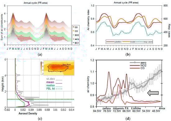 Meteorological influences on Caribbean air chemistry have been analyzed using in-situ, satellite and model data, with a focus on Puerto Rico. The air quality fluctuates at certain rhythms from 7-year to 10-day. Rainy weather and cleaner air prevails from June to November, so the focus was on the dry winter–spring season. Mineral dust and agricultural smoke from Africa (and South America) take many days of transport to reach the Caribbean. Along the way, the air undergoes deposition and mixing with air masses containing local urban, industrial and volcanic emissions, and pollen, bacteria, fungal spores and virus microbes. While the Saharan dust plumes are prevalent in mid-summer, hospital respiratory admissions tend to peak in March–April (cf. Figure 2f), following the sum of aerosol and trace gases: AOD f/c, AOT, BC, CO, NO2, O3, SO2. This season coincides with lowest soil moisture, increased fire emissions and high pollen loading.