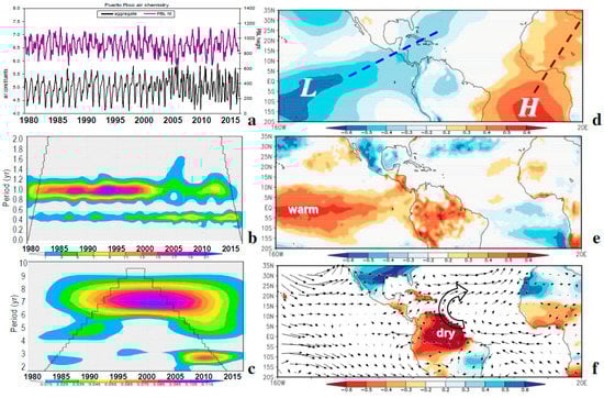 Monthly time series of MERRA2 PBL height and air chemistry over Puerto Rico since 1980 (Figure 4a,b) reveal a corresponding annual cycle and year-to-year fluctuations. After 2000, the air index becomes more chaotic, presumably due to the inclusion of satellite data. Its wavelet spectra show that one-year cycles are replaced by half-year cycles around 2000 (Figure 4b). After filtering, the Puerto Rico air index displays significant 7-year cycles and a 3-year rhythm after 2005 (Figure 4c). The SL air pressure and SST correlation maps with respect to the December–May air index (Figure 4d,e) point to Pacific El Niño as an influence, similar to []. Above normal SST in the equatorial zone and a (low) trough extending into the Northeast Pacific correspond with higher air pollutants. Below normal SST in the South Atlantic and a (high) ridge extending into the African Sahel form part of this pattern of influence at the climate time scale. The soil moisture correlation map (Figure 4f) reveals dry conditions over the northern Amazon Basin and West Africa, suggesting a higher probability of biomass burning and fire emissions. The wind correlation map reflects Pacific El Niño (westerly) circulation anomalies and a local conveyor belt. Easterly wind anomalies in the equatorial Atlantic sweep over the northern Amazon and into the Caribbean.