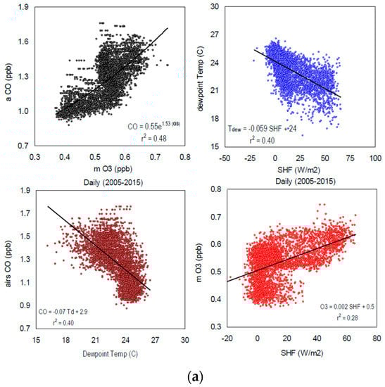 Table 3 lists the daily correlations and reveals significant values for AOD f/c with respect to OLR, Tdew, U wind and SHF. O3 and CO display similar relationships to weather variables: negative with Tdew and positive with SHF (cf. scatterplots Figure 5a). AOT is weakly negative correlated with OLR, while NO2 shows little sensitivity or agreement with weather variables and air constituents, perhaps being more local/episodic than remote/seasonal. Naturally, the air index (Figure 5a) is related with its constituents: CO r = +0.61, O3 + 0.60, NO2 + 0.56, AOD f/c + 0.44, AOT + 0.39; and also with certain meteorological variables: SHF +0.46 and Tdew −0.37, indicating that warm dry weather helps liberate, suspend and accumulate particles and gases over Puerto Rico. Tdew is negatively related with SHF (cf. Figure 5a) and consequently to surface heating over the island. In respect to respiratory complaints, Newhouse and Levetin [] found correlation with low Tdew/humidity, while Gent et al. [] noted correlation with high O3/air temperature. Here, a multi-variate regression of 12 candidate meteorological predictors, subsequently reduced to +SHF and −Tdew to predict 22% of daily pollution variability.