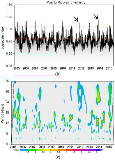 (a) Scatterplots of daily air constituents and weather variables with regression fit, cf. Table 3; (b) Daily time series of Puerto Rico air index with case studies (arrows) and thresholds (red lines); (c) Wavelet spectral analysis of air index shaded >90% confidence.
