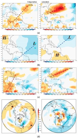 Correlation maps are analyzed with respect to the December–May daily Puerto Rico air index >0.8 for Tdew, SL air pressure and satellite OLR in Figure 6a–c. Five days before air pollution rises in Puerto Rico, a dry line (−Tdew, +OLR) extends from Panama to Hispaniola. This feature shifts to the north of Puerto Rico on days with peak concentration. The SL air pressure correlation map five days before, shows a high cell situated over the Gulf of Mexico and a low trough over the Atlantic. The troughs shift northward and a high cell emerges over South America. This pattern limits dispersion, and suggests tropical inflow to a sub-tropical Rossby wave during spring-time pollution episodes.