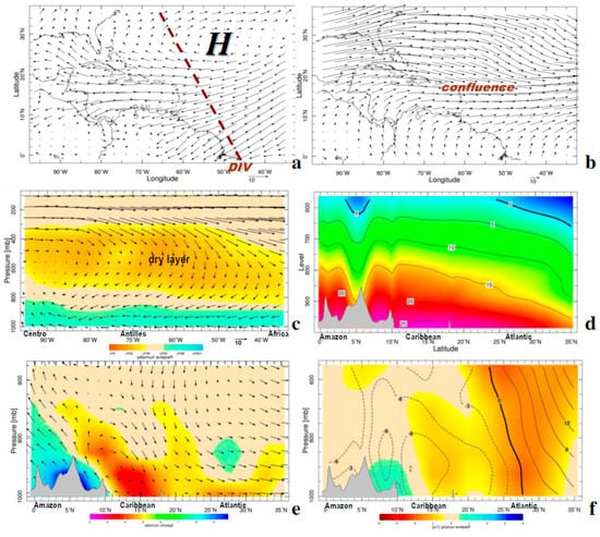 The N–S section shows that air temperatures are warm up to 800 hPa over the Caribbean, and consequently stable (Figure 7d). The Hadley circulation on composite air pollution days (Figure 7e) exhibits a shallow overturning rotor with convergence/rising over South America and divergence/sinking over the Antilles. The zonal circulation (Figure 7f) features an intrusion of anticyclonic vorticity due to the sub-tropical jet stream. The composites suggest accentuated zonal flows that bring dust from Africa and promote anticyclonic divergence and locally warm dry weather. The key feature is a southward shift of the sub-tropical jet stream, causing upper level convergence that limits dispersion.