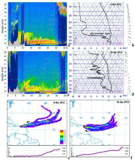 HYSPLIT back-trajectories in the two cases (Figure 8e,f) are dominated by westward movement and air parcels ultimately originating from northwest Africa. The trajectories are straighter in the 1–6 March 2012 case, but sweep toward Puerto Rico with anticyclonic curvature in the 25–30 April 2014 case, possibly entraining volcanic emissions from Montserrat. In both cases, the vertical section of back-trajectories indicates steady sinking from the Atlantic to the Antilles. In the 25–30 April 2014 case, the sinking is through a deeper layer, while in the 1–6 March 2012 case the aerosol-laden air reaches the surface well east of Puerto Rico.