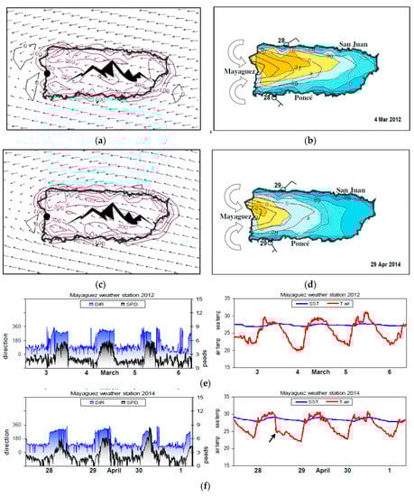 The reader will have noted wind shadows and pollution hot spots in the earlier results (cf. Figure 1b and Figure 2c). These features are analyzed for Puerto Rico using high resolution NAM fields of wind and temperature, and weather station data from the leeward coast (Figure 9a–f). On 4 March 2012 and 29 April 2014, afternoon trade winds >6 m/s converge over the heated island, where SHF exceeds 200 W/m2. At Mayaguez on the west coast, a seabreeze >4 m/s blows from 10:00–18:00 due to the horizontal temperature gradient. The seabreeze opposes the trade winds and traps emissions, but may also trigger afternoon showers (i.e., 28 April 2014, Figure 9f).