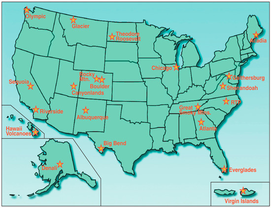 In the early 1990s, the EPA’s Office of Research and Development (ORD) originally designed a UVR monitoring network of five to seven sites principally in urban areas, with a few “pristine” rural sites for monitoring background UVR levels. The EPA’s role in UVR research was to monitor in urban areas. The United States Department of Agriculture (USDA) was responsible for monitoring UVR in rural areas. The focus of the EPA’s original UVR network design was shifted in 1996. In September 1996, the US EPA and US National Parks Service (NPS), of the US Department of the Interior (DOI), signed an Interagency Agreement (IAG) to cooperate on a program of long-term monitoring of environmental stressors, including UVR, at 21 separate locations throughout the United States. When the NPS sites were added to the network, it greatly expanded the EPA’s UVR monitoring program. The EPA’s UVR Monitoring Network facilitated research on the observed effects that environmental stressors, including UVR, pose on various ecosystems and on human health. The 21 EPA UVR monitoring sites (displayed in Figure 1) were located throughout the continental United States, Alaska (Denali National Park), Hawaii (Hawaii Volcanoes National Park) and the US Virgin Islands (Virgin Islands National Park, St. Johns, VI). Fourteen of the sites were located in US National Parks, and seven sites were located in urban settings. Data collected from the 21 sites was processed through a quality assurance protocol to ensure proper characterization of UVR intensities measured at each site.