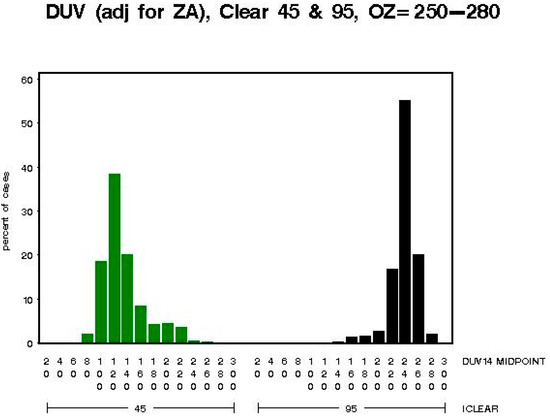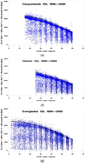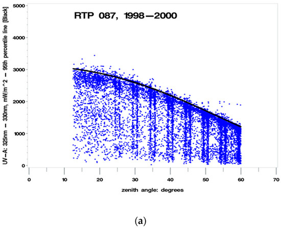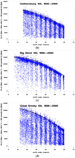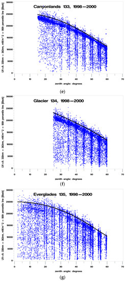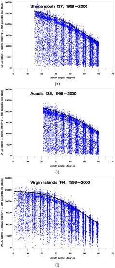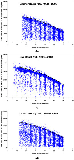 - Percent clearness = 100% to 120% [accounting for cloud “reflections”]—Note: enhancement of UVR by cloud reflections has been measured at up to 30 percent [20], therefore using a 20% enhancement (120%) for maximum biologically damaging UV radiation values provides a reasonable and conservative estimate where the percent clearness (cloudiness) would be measured by satellites and/or from ground-based instruments. Total column ozone was not measured using instruments at the sites, and cloudiness could not be assessed independent of human observation. The instruments could not (and cannot) measure biologically damaging UV radiation at fixed SZAs for extended periods, therefore the ideal experimental setup had to be adjusted to conform to the limitations of real-world constraints. When developing a preliminary methodology for implementing this hypothesis, an examination of the initial set of UV325 versus SZA plots that were generated by the statistical software indicated that “clear” was best defined as a SZA-dependent polynomial approximation of the 95th percentile of the UV325 measurements. This polynomial approximation was determined to be satisfactory, since it captured almost all of the upper values, and allowed some values to exceed clear by at least 20 percent, possibly due to cloud reflections, as noted in the literature [20].
