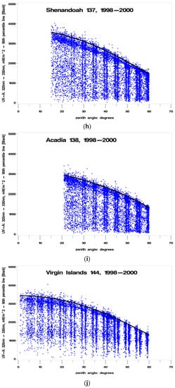 Plot of UV325 versus solar zenith angle (SZA) at (a) Research Triangle Park, NC; (b) Gaithersburg, MD; (c) Big Bend National Park, TX; (d) Great Smoky Mountain National Park, TN; (e) Canyonlands National Park, UT; (f) Glacier National Park, MT; (g) Everglades National Park, FL; (h) Shenandoah National Park, VA; (i) Acadia National Park, ME; (j) Virgin Islands National Park (St. John), USVI (CLR1, illustrated by the black line, represents the polynomial of the 95th percentile measurement at each SZA).