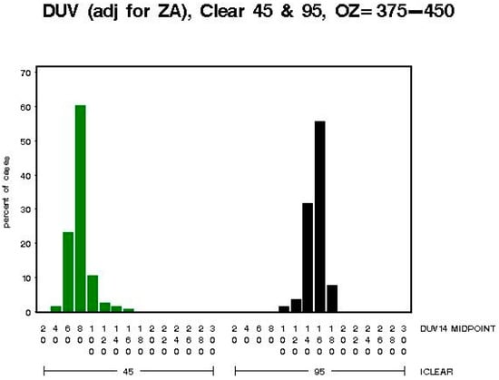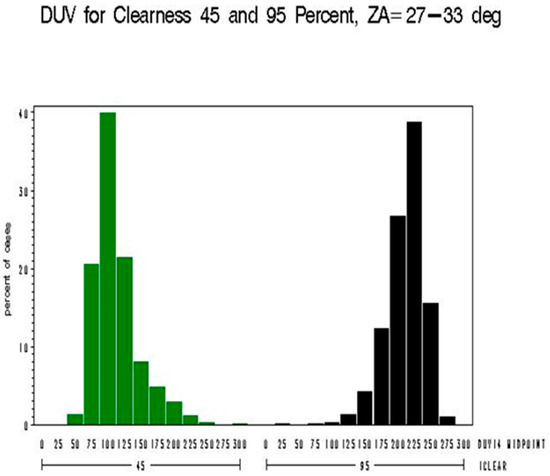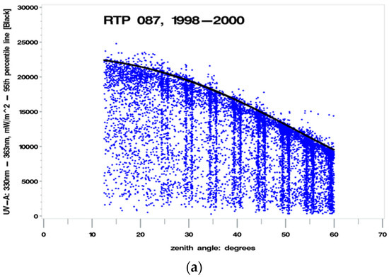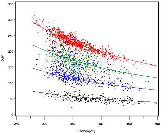 The vertical lines shown in Figure 5 are an artifact of how the Brewer is configured to capture UV scan measurement data. During the analysis of the UVR data, various parameters were kept in a limited range such as SZA, at less than 60 degrees (60°), and wavelengths, at less than 330 nm, to ensure that only the effect of clouds would manifest itself in the analysis. There were five modeling approaches used in the analysis of the 71,000 data points analyzed between 1998 and 2000 at the 10 UVR monitoring sites. Four of the five modeling approaches are based on “thought experiments”, using empirical data, and one model is based on a purely empirical relationship (Beer–Lambert’s Law). The five different modeling approaches were compared to each other, and these five models each related the biologically damaging UV radiation to the following set of parameters (as illustrated in Table 2: Model A—(1) total column ozone [O3], (2) percent (%) clear sky {i.e., percent clearness/cloudiness} [CLR], (3) SZA; Model B—(1) total column ozone [O3], (2) “clear” [replaces the “CLR” term, and is calculated by performing a regression on percentage “classes” of cloud cover, and the result of the regression is called iclear]; “iclear” is the parameter describing cloudiness (as discrete percentage levels grouped into different classes), based on the maximum range of UV irradiance values, (3) SZA; Model C—(1) total column ozone [O3], (2) “iclear*” [replaces the “CLR” term, and is calculated by performing a regression on percentage “classes” of cloud cover, with the removal of the tails of the biologically damaging UV radiation distribution, i.e., censor “bad” data (remove the extreme values below the 2.5th percentile and above the 97.5th percentile), and the result is called iclear*], (3) SZA—Note: This is the same as Model B, except with the tails of the biologically damaging UV radiation distribution removed; Model D—(1) total column ozone [O3], (2) CLR^ [replaces CLR with a linear function in percent clearness {“classes” of CLR} between 40% and 100% clear skies], (3) SZA; Model E—(1) total column ozone [O3]/cos(SZA), and (2) cos(SZA): This is an empirical relationship known as Beer–Lambert’s Law. At the 10 UVR monitoring sites selected for the analysis, the NASA Total Ozone Mapping Spectrometer (TOMS) satellites were used to measure total column ozone. This provided the benefit of an independent measurement source for determining atmospheric (total column) ozone.