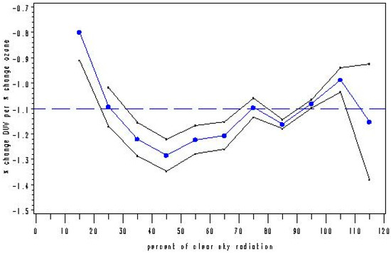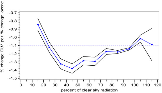 The results show that for all models except Model C (censored tails), in the 35% to 65% range of clear sky radiation (65% to 35% cloudiness), as cloudiness decreases, RAF increases, ranging from −1.2 to −1.4, where it reaches its highest level before decreasing. Between 15% and 25% clear sky radiation (85% to 75% cloudiness), there is an increase in RAF for all models. In general, RAF tends to increase as the sky conditions change from high to moderate cloudiness. Clouds block biologically damaging UV radiation in this range and the behavior is qualitatively the same as if stratospheric ozone was increased. UVR can experience a 4.3% increase per kilometer of altitude, from 0 km to 6.2 km, and is also affected by atmospheric pressure and aerosol density [23]. It is noted in the literature that mean cloud attenuation of UVR in the UV-B (wavelengths: 280–315 nm) is approximately 15–30% [24]. UV radiation is also reflected by both clouds and the Earth’s surface [25], which complicates analyses in this area. Erythemally-weighted UV-B has displayed a 3–7% decadal increase in mid and high latitudes from Nimbus 7 satellite observations [26]. For 105% to 120% clear sky radiation, RAF increases for Models A, B and E, while decreasing for Models C and D. The RAF is important because it serves as a sensitivity metric that directly relates changes in stratospheric ozone to changes in the UVR flux reaching the Earth’s surface. Overall, the resulting RAF values from the five modeling approaches are consistent with those found in [27].