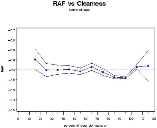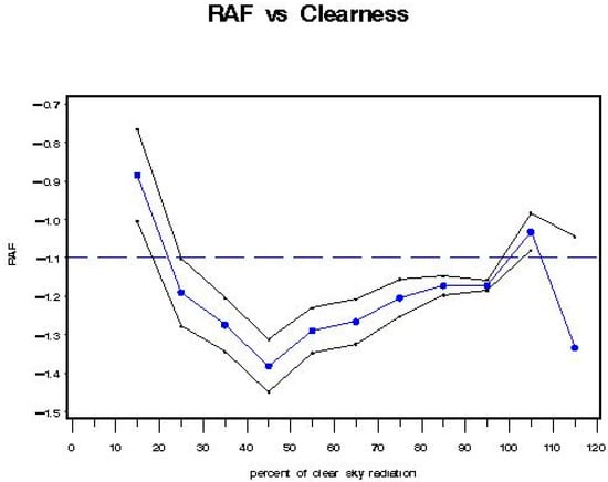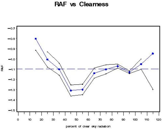 The black line envelope in Figure 16 gives the 2-sigma (95%) confidence interval around the value of the RAF. The results were similar to those found in Model B for individual regressions using the “iclear*” parameter to represent classes of percent clearness. Note in Figure 16 the “dip” in RAF values between 45–55% clearness. This could indicate isolated clouds passing over the sun during individual measurement scan periods.