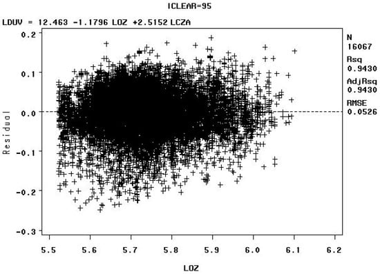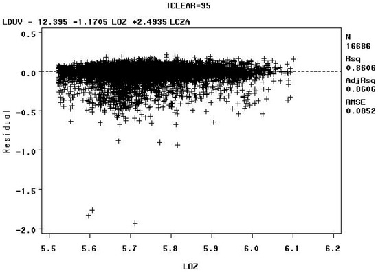 The Model C residuals versus the natural logarithm of the total column ozone value in Dobson Units (LOZ) for sky clearness percentages of 90–100% (iclear = 95) indicate that biologically damaging UV radiation mostly clusters around the expected values, with a high R2 value, as shown in Figure 14 below. The high R2 value for Model C can be attributed to the fact that extreme values were removed by data censoring. The R2 values for the residuals of the other models are lower than Model C and display more scatter.