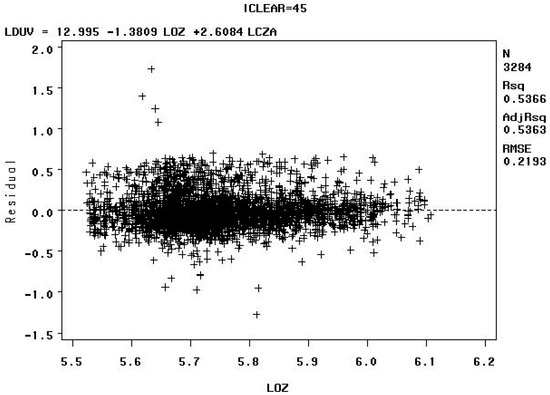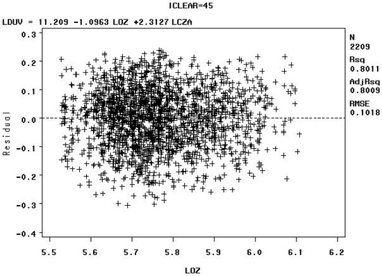 Model C: Residuals versus the natural logarithm of the total column ozone value in Dobson Units (LOZ) for sky clearness class 40% to 50% (iclear = 45) with removal of the “tails” of the biologically damaging UV radiation distributions—Note: LCZA = natural logarithm of the cosine of the solar zenith angle, LDUV = natural logarithm of the biologically damaging UV radiation, and LOZ = natural logarithm of the total column ozone.