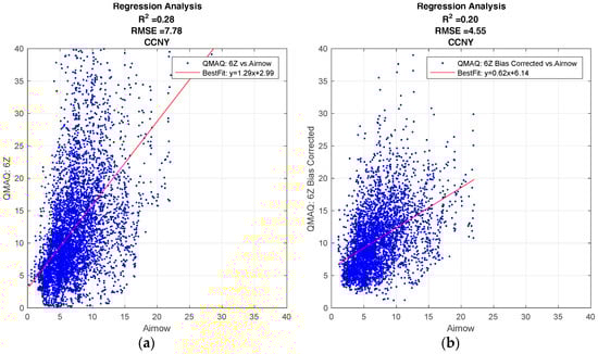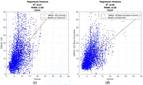 Community Multi-Scale Air Quality (CMAQ) regression analysis. (a) Standard, 06Z release time; (b) Bias Corrected, 06Z release time; (c) Standard, 12Z release time; (d) Bias Corrected, 12Z release time.