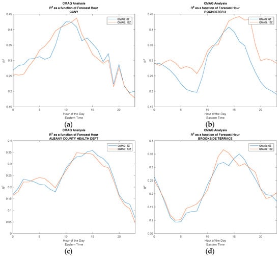 Comparing the effect of different release times for CMAQ by plotting the R2 value as a function of time of day. (a) City College of New York (CCNY); (b) Rochester; (c) Albany; (d) Brookside Terrace.