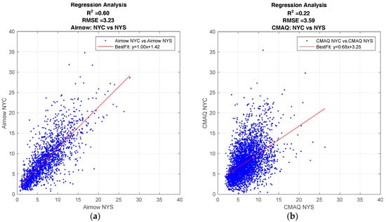 Regression analysis comparing PM2.5 levels between NYC and the rest of NYS (non-NYC sites). (a) Multi-year day-averaged PM2.5 analysis from NYSDEC ground observations; (b) CMAQ model comparison between NYC and NYS.