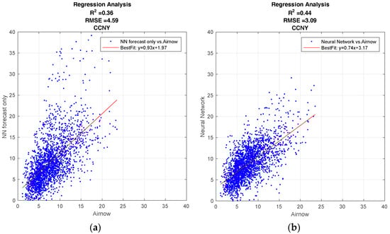 Figure 4a shows the performance of the NN using the forecast metrological data as inputs, while Figure 4b shows the performance of the NN using the difference between the forecast and the current days measurements. The NN utilizing the difference configuration is clearly better, with a higher R2 value, 0.44 compared to 0.36, and a lower root-mean-square value, 3.09 compared to 4.59. In addition, there are substantially less anomalous high PM2.5 forecasts. Since this improvement was seen in all test cases, we only used scenario 2, (differential meteorology) NN configuration. From these results, we see that meteorological trends are better indicators of PM2.5 than meteorology alone. This appears to us to be a reasonable result since the meteorology trend better isolates particular mesoscale conditions, which is known to be a significant factor in boundary layer dynamics.
