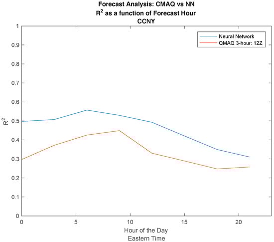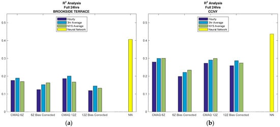 The R2 value for CMAQ and the NN, both compared to AirNow observations, is computed for each forecast model and for each location. As a representative example of the overall performance, the R2 value for NYC, represented by CCNY, is compared to NYS, represented by Brookside Terrace, a non-NYC, non-urban station, and these results are displayed in Figure 5. The individual results for each location can be found in the supplementary materials.