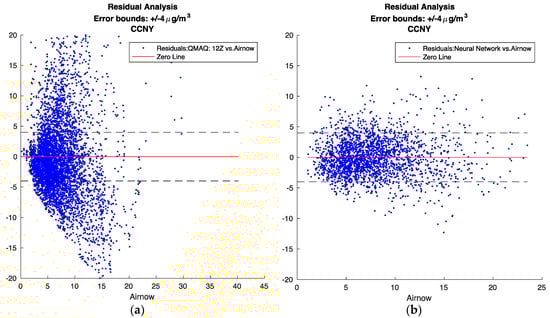 Residual analysis. The standard deviation of PM2.5 from the AirNow ground monitoring sites was calculated to be 4 μg/m3, therefore, +/−4 μg/m3 was used for the error bounds (a) CMAQ; (b) Neural Network.