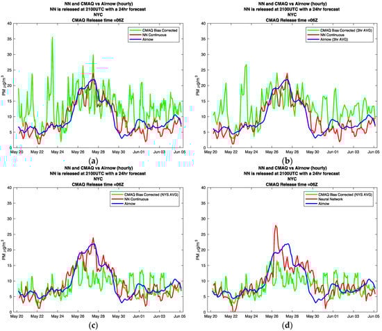 NYC surface PM2.5 levels affected from the wildfires of Alberta Canada 2016. The plots focus on the aloft plumes mixing down into the PBL on May 25. The plots show different models vs. AirNow observation (a) CMAQ Biased hourly, NN continuous; (b) CMAQ Biased 3-h average, NN continuous; (c) CMAQ Biased state average, NN continuous; (d) CMAQ Biased state average, standard Neural Network.