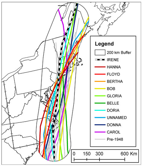 The first task was to identify TCs that are analogs for the track of Irene over the U.S. Latitude and longitude coordinates from the six-hourly positions of Irene and all TCs spanning 1851–2016 were obtained from HURDAT2 [39]. These coordinates and entered into a GIS and positions located 30–50° N were converted into lines representing each storm’s track. The line representing Irene’s track was buffered by 200 km to select tracks that were (a) near the U.S. coastline and (b) a similar distance from the Appalachian Mountains to control for the effects of topography on rainfall enhancement. The buffered track of Irene (Figure 1) was used to clip the tracks of the other TCs, and new attributes of track length and orientation were calculated for 347 tracks within the buffered region. From these, 24 TCs were identified as having a track segment of at least 1150 km within the buffer with north to northeast orientation. These TCs also make landfall over or pass within 100 km east of North Carolina, and make landfall in New York, Connecticut, Rhode Island, or Massachusetts. These TCs represent the best track analogs for Irene as it affected the U.S. Having a similar track implies that the TCs encountered similar steering currents provided by the Bermuda-Azores High and timing of interactions with middle-latitude troughs. The latitude and longitude of landfall, intensity at the time of landfall, time until the storm dissipated or completed an extratropical transition, and the coordinates needed to calculate storm trajectory through the study region were also taken from HURDAT2.