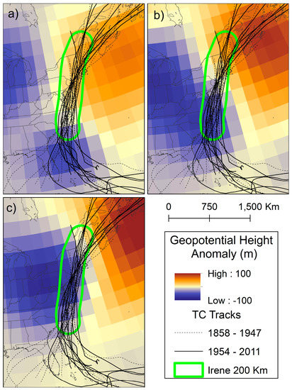 During 1851–2016, 24 TCs had tracks through the study region with a trajectory similar to Irene (Figure 1), meaning that this type of track has a recurrence interval of approximately 6.6 years. Four (three) such TCs occurred in the 1860s (1900s and 1990s). The most common month of occurrence is September, although one case occurred in May and another in November. A track density map reveals that these storms took tracks different from the majority of TCs located just offshore of North Carolina. From this region, TCs tend to move northeast and stay offshore rather than moving north-northeast and making additional U.S. landfalls as occurred during Irene (Figure 2). An examination of the 500 hPa geopotential height anomalies reveals the positions of the features responsible for steering Irene and other similar TCs since 1948 (Figure 3). The presence of positive anomalies east of the storm track indicates the position of a blocking ridge, while negative anomalies northwest of the storm track indicate and upper-level trough positioned to interact with the TC and aid in extratropical transition. On the day prior to entering the study region, anomalously low geopotential heights associated with a trough are located over the Midwestern U.S. while a ridge, indicated by higher than normal heights, is positioned off the coast of Nova Scotia, Canada (Figure 3a). The anomalously low heights near Florida are associated with the TCs. The axis of the trough at 200 hPa is located approximately 10° west of the TC centers. On the day of landfall (Figure 3b), the trough and TC are no longer distinct features and the increasingly negative values indicate a deeper area of low pressure. The deepening of the trough and northward heat and momentum transfer to the right of the TC center strengthen the warm advection in the ridge, which also deepens. The phasing of the trough and TC are complete by the day after landfall (Figure 3c). The baroclinic conditions associated with the trough restructure most of the TCs into extratropical cyclones while accelerating motion [8,11]. However, the strengthening ridge located in an anomalous position farther north and east (Figure 3b,c) forces the systems to move north-northeast along the coastline of the U.S. rather than northeast and out to sea.