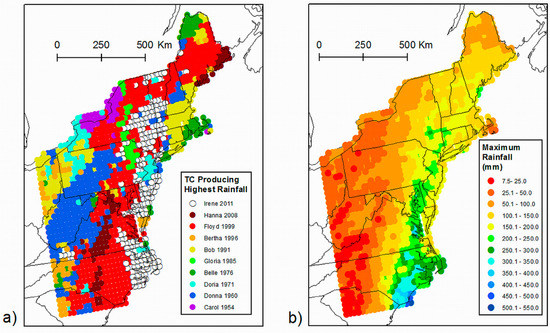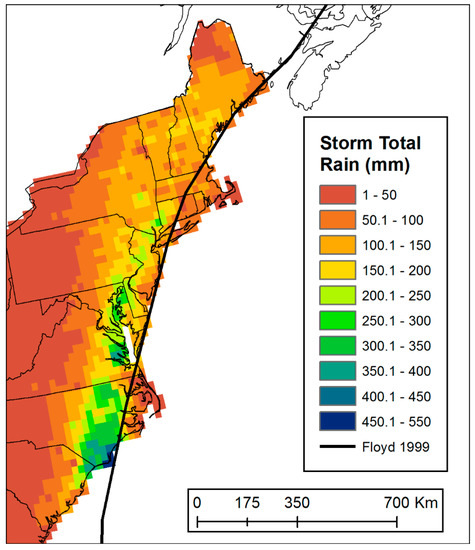 These results should be taken into consideration when planning for TC-associated rainfall events in the northeastern United States. Tropical cyclones have produced floods that exceed the 10-year flood peak along much of the U.S. east of the Appalachian Mountains [5]. The current study found that the highest rainfall totals tend to occur on average 75–125 km away from the storm track on the left side, with the farthest distances ranging 150–230 km from the track. Therefore, communities located within 250 km west of the projected storm track should be prepared to receive high rainfall totals. The amount of moisture available plays a large role in determining the maximum potential for rainfall [66], and models predicting future climate conditions suggest that increased moisture will be available to be converged into a TC to increase rain rates both near to and more than 200 km from the storm center [74,75]. Thus, higher rainfall totals than produced by Irene or Floyd could be experienced in the study region, prompting flooding and associated destruction to occur over a larger area.