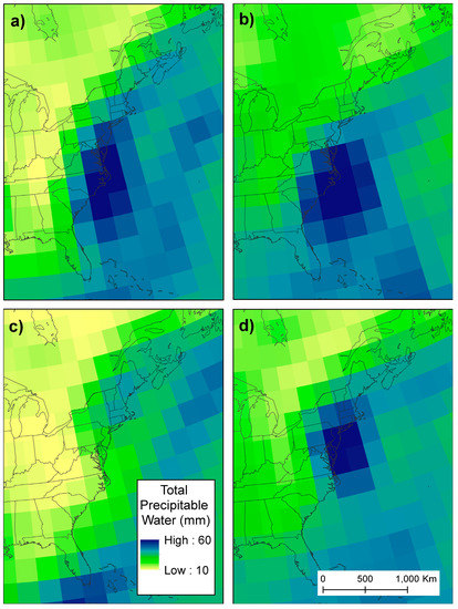 The synoptic-scale influences on the precipitation produced by Floyd have been well-documented in the literature, including the position of the frontal boundary and location of highest rain rates just west of this boundary [6,7,63,64,65]. When comparing precipitable water values obtained from the NCEP/NCAR Reanalysis [46] on the day of landfall for Irene and Floyd, a gradient in values ranging from 63 through 44 to 21 mm left of track over North Carolina existed for Floyd (Figure 6a). In the same locations, values for Irene only decreased from 67 through 51 to 33 mm (Figure 6b). The steeper gradient for Floyd likely promoted stronger isentropic ascent of tropical moisture leading to the higher rainfall totals produced by Floyd over North Carolina as compared to Irene. When inspecting the rainfall totals near southeastern New York, southern Vermont, and western Massachusetts, it can be seen that Irene produced higher amounts relative to Floyd by more than 50 mm. These are the areas where extensive flooding occurred after Irene. Recent work by [5] shows that the flooding caused by Irene in this region was 2–3 times larger than the 10-year peak flood. A comparison of precipitable water values when both TCs were located near this area (Figure 6c,d) shows that values for Irene exceeded 50 mm (Figure 6d) while those for Floyd approximated 40 mm. This finding supports previous research showing that higher amounts of moisture in the environment surrounding a TC can lead to a larger storm with more wide-spread rainfall [30,31,32,33,34,66].