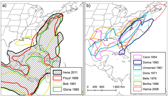 Correlations between the distance from the track of the high rainfall totals, rather than the actual amounts, and latitude provide a measure of rain field expansion or contraction as the TCs move with a dominant northward component to their track. TCs that are transitioning into extratropical cyclones are expected to exhibit an expansion in or dispersion of their rain fields [6,13,45], although the increase in translational speed during the process may lower the rainfall totals received as the storm moves inland. Significant positive coefficients indicate expansion for Floyd, Bertha, Gloria, Unnamed, and Carol. Contraction is indicated for Belle, a TC that did not become extratropical. However, Irene did not produce high rainfall totals that expanded or contracted relative to the track’s location even though it was at a similar stage in the ET process as Bertha and exhibited a similar increase in speed as it tracked across the study region.