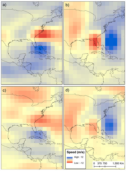 As storm translational speed influences the total amount of rainfall that a location can receive, speed is calculated at the time the TC enters and exits the study region. Spearman’s correlation coefficients are calculated between the spatial pattern and amount of rainfall produced by each TC and the translational speed of the storm as it entered and exited the study region. An examination of the synoptic-scale environment around the storm helps determine the features responsible for storm motion. For all TCs forming after 1948, the average daily anomalies of the geopotential height of 500 hPa pressure for each TC on the day of landfall were obtained from the NCEP/NCAR reanalysis project [46], and the values for all 11 TCs were averaged together. The distance between the TC and middle-latitude circulation features as well as the strength of the middle-latitude features influence TC structure and hence its rainfall production [47].