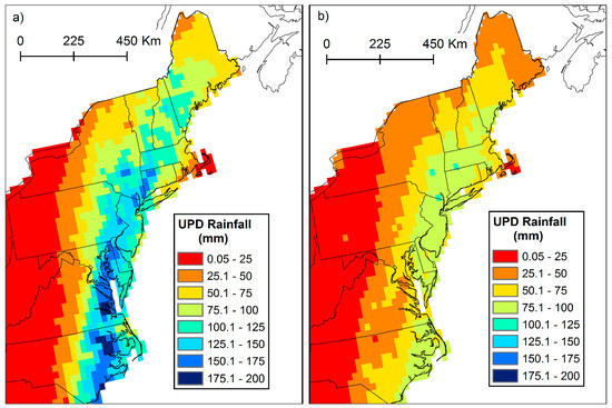According to the UPD analysis (Figure 4), the maximum value for storm total rainfall was 325 mm (12.8 in.) located near Washington NC, approximately 35 km (one UPD grid cell) from Bayboro where the maximum rainfall amount of 393 mm (15.74 in.) occurred according to the NHC. A comparison with totals greater than 150 mm contained in the NHC report [3] showed that the UPD tended to underestimate storm total rainfall by 50–75 mm, but the locations of the higher amounts were consistent. Underestimation of rainfall by this interpolated and gridded dataset is expected and has been documented for TCs by Atallah et al. [6], yet these results suggest that the locations of the highest rainfall totals should be comparable across storms.