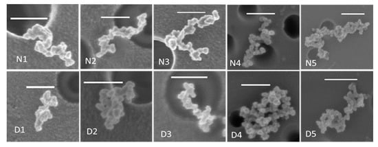 SEM micrographs of nascent (N) and thermodenuded (D) soot particles. The white horizontal bar in each micrograph represents a length scale of 200 nm. Dark circles are the holes in the filter.