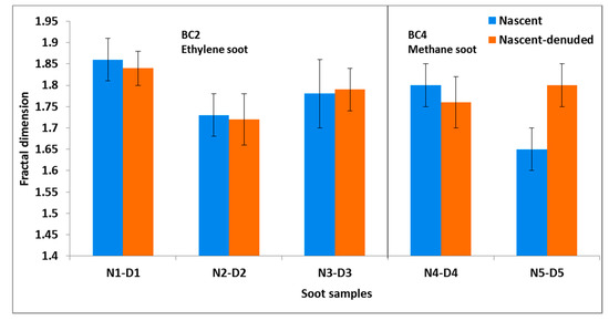 For all five sample sets, Df lies between 1.65 and 1.86 (Table 1). The derivation of Df and plots for all of the samples are shown in the supplementary material (Figure S1). These values of Df are in agreement with the observations made in previous studies on nascent soot particles produced from different fuel sources [3,65]. Also for all nascent vs. denuded pairs (except for the nascent-oxidized pair: N5-D5), there is no significant change (within 1) in Df after thermodenuding (Figure 4). For the N5-D5 pair, the Df changes by about 9% (from 1.65 to 1.80), whereas for all other cases, the change is less than 2.3%. The CPMA data for the BC4 sample shows that the mass decreased from 2.37 to 2.34 fg for nascent soot, while for the nascent-oxidized soot of the same mobility size, the mass decreased from 2.41 to 2.18 fg after thermodenuding. The larger decrease in mass for the nascent oxidized soot suggests that the coating material on the oxidized soot was removed during thermodenuding. A possible explanation for the increase of Df after thermodenuding the oxidized soot might be that the soot structure was slightly modified during the evaporation of the coating material. Interestingly, for the BC2 soot samples, there is no significant change in Df despite the significant change in mass (up to ~29%) of soot after thermodenuding (see CPMA data in Table 1). This result suggests that for the BC2 sample sets, the removal of the coating present on nascent soot did not affect the structure of soot. This is most probably due to the chemical composition of the organics that were removed by TD. This result is consistent with the thermodenuding experiment of uncoated soot (fractal soot generated at lower = 2.1) by Slowik et al. [64] that found no change in Df (derived from mass-mobility relation in their case) after denuding. They suggested that the removal of organics from the uncoated soot during denuding cannot change the skeletal framework of soot. Cross et al. [9] observed only minor restructuring of soot when dioctyl sebacate coating was removed by thermodenuding, suggesting that the removal of organic coating may have little impact on the restructuring of soot. For soot from a flat flame burner, Slowik et al. [66] found that the organic carbon (OC) content (mass fraction of 0.1) was composed of a comparable amount of aliphatic and aromatic compounds at a lower , but at a higher , the OC content (mass fraction of 0.55) had only a minor fraction of aliphatic compounds. We thus hypothesize that the nascent organics on the soot from the BC2 experiments considered here consisted in a large fraction of aliphatic compounds.