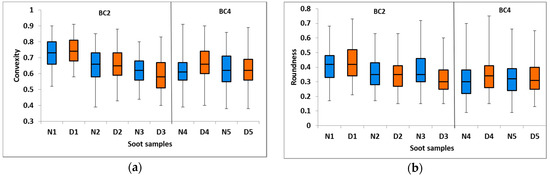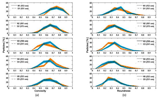 For the N3-D3 pair, the distribution of convexity and roundness peaks at slightly lower values after thermodenuding. The convexity of particles decreases slightly with the increasing value of the mobility diameter for both nascent and denuded particles. This suggests that the smaller soot particles are more compact when compared to larger particles, in agreement with previous studies [68,69]. Figure 6a also suggests that for smaller mobility diameters, the convexity of soot from the ethylene diffusion flame might be less affected by thermodenuding as compared to the larger sized particles. With the methane diffusion flame (N4-D4 and N5-D5 sets) particles showed negligible changes in roundness and convexity after thermodenuding, for both nascent and nascent-oxidized soot (Figure 6a N4-D4 and N5-D5, respectively).