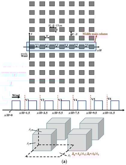 As shown in Figure 1a, Brown et al. [50] measured turbulent airflows in a seven-row and 11-column cubic building array with a parallel approaching wind. Building width (B), building height (H), and street width (W) are the same (B = H = W = 15 cm, H/W = 1, building packing densities λp = λf = 0.25, Lx = 13H, Ly = 21H). The scale ratio to full-scale models is 1:200. x, y, and z are the stream-wise, span-wise (lateral), and vertical directions. x/H = 0 represents the location of windward street opening. y/H = 0 is the vertical symmetric plane of the middle column. Point Vi represents the center point of the secondary street No. i. The measured vertical profiles of time-averaged (or mean) velocity components (stream-wise velocity , vertical velocity ), and turbulence kinetic energy at Points Vi are used to evaluate CFD simulations.