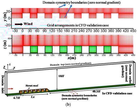 In the CFD validation case, the full-scale seven-row building array is numerically investigated (B = H = W = 30 m, λp = λf = 0.25, H/W = 1; see Figure 1b). According to the literature [23,51,52,53], the lateral urban boundaries hardly affect airflows in the middle column as the wind tunnel model is sufficiently wide in the lateral (y) direction (Ly = 21H). Thus, it is effective to only consider half of this middle column (shaded area in Figure 1a) to reduce the computational requirement. Figure 1b shows model geometry, grid arrangements, CFD domain, and boundary conditions. In particular, the distances of UCL boundaries to the domain inlet, domain outlet, and domain top are 6.7H, 40.3H, and 9.0H, respectively. Zero normal gradient condition is used at the domain top, domain outlet, and two lateral domain symmetry boundaries. At the domain inlet, the measured power-law profile of time-averaged (or mean) velocity U0(z) in the upstream free flow is adopted (see Equation (1a)) (Brown et al. [51]). Moreover, the vertical profiles of turbulent kinetic energy k(z) and its dissipation rate (ε) at the domain inlet are calculated by Equations (1b) and (1c) [23,51,52,53]: