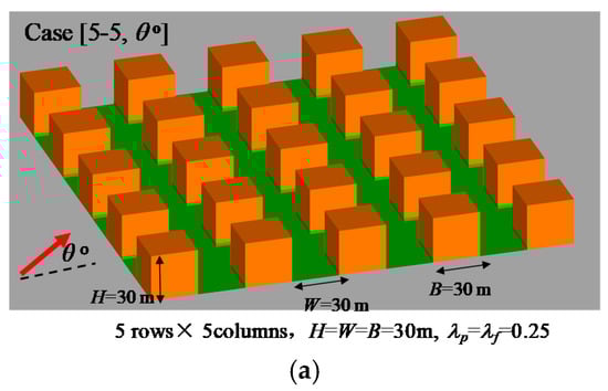 As displayed in Table 1 and Figure 2a–d, two groups of medium-dense UCL models (H = B = W = 30 m, λp = λf = 0.25) are investigated in CFD simulations. The row and column numbers are referred to the numbers of buildings along the stream-wise direction (x, main streets) and span-wise direction (y, secondary streets). Wind directions are represented by the angles (θ = 0° to 90°) between the approaching wind and the main streets.