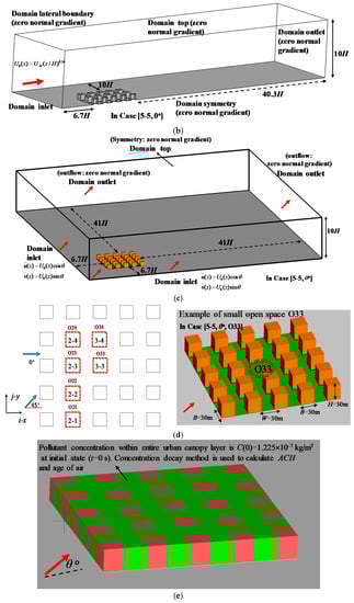 In recent years, various ventilation indices have been applied for UCL ventilation assessment, such as pollutant retention time and purging flow rate [2,7,23], age of air and ventilation efficiency [3,4,5,6,7,23], in-canopy velocity and exchange velocity [22,25], net escape velocity [31], etc. Similar to indoor ventilation [32,33,34,35,36], the key point of applying these ventilation indices is based on the UCL ventilation processes as below: The surrounding external air is relatively clean and can be transported into urban areas to aid pollutant dilution with physical processes of horizontal dilution, vertical transport, recirculation of contaminants, and turbulent diffusion. In this sense, the tracer gas technique originated from indoor ventilation sciences has been used to predict outdoor ventilation by analyzing the final steady-state pollutant concentrations or the transient concentration decay history, which illustrates the processes of pollutant dilution and ventilation. For example, the concept of purging flow rate (PFR) was adopted to assess the net flow rate of flushing the urban domain [2] or the entire urban canopy layer [23] induced by the convection and turbulent diffusion. Moreover, the urban age of air [3,4,5,6,7] represents how long the external air can reach a place after it enters the UCL space. Hang et al. [3] first adopted the homogeneous emission method into CFD simulations [32] to calculate the urban age of air for quantifying the characteristics of wind supplying external air into UCL space for pollutant dilution.