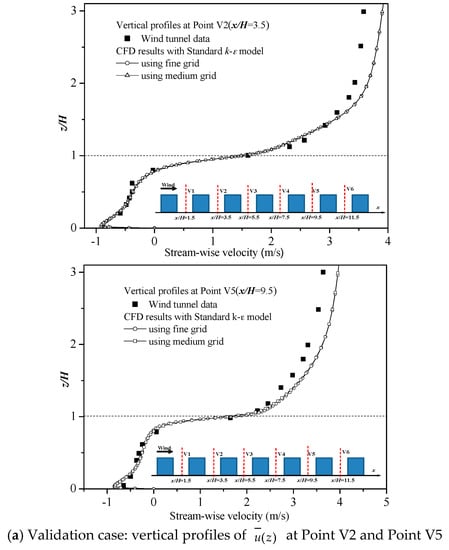 To validate CFD simulations, Figure 3 compares wind tunnel data and CFD results in the CFD validation case by using the fine and medium grid, including time-averaged stream-wise velocity and turbulent kinetic energy at Point V2 and Point V5. Compared to wind tunnel data, the standard k-ε model with present grid arrangements can provide results of mean flows in good agreement with wind tunnel data, but does a little worse at predicting and can only predict the shape of vertical profile well. Such findings are similar with the same CFD validation studies the literature [23,51,52,53]. In addition, CFD results with the fine grid are only slightly different from those with the present medium grid. Given the results from the validation tests, we conclude that the application of the standard k-ε model with present grid arrangement is acceptable for the purposes of our research. There are relatively large discrepancies of stream-wise velocity between the simulated and measured results at the higher area. The possible reason is the ratio of vertical grid size to the stream-wise grid size is relatively large at much higher levels above the building roofs (i.e., at the higher area). However, the simulation results below and near the building roofs are performed in good quality, which is more important for UCL ventilation assessment.