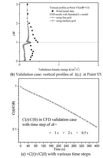 Finally, with this CFD setup, Figure 3c shows the effects of time steps on the decay history of spatial mean concentration (<C(t)>/C(0)). The decay rates for three time steps (dt = 0.5, 1, 2 s) are almost the same, confirming that the present time step (dt = 1 s) is good enough for ACH prediction.