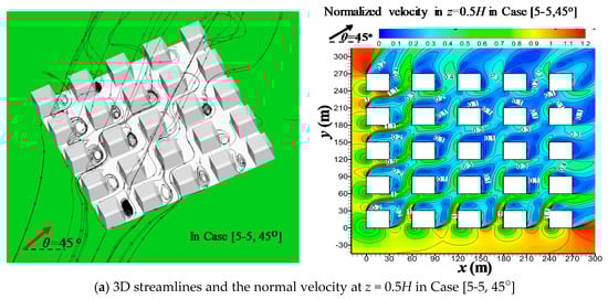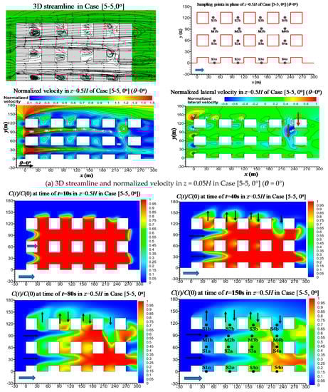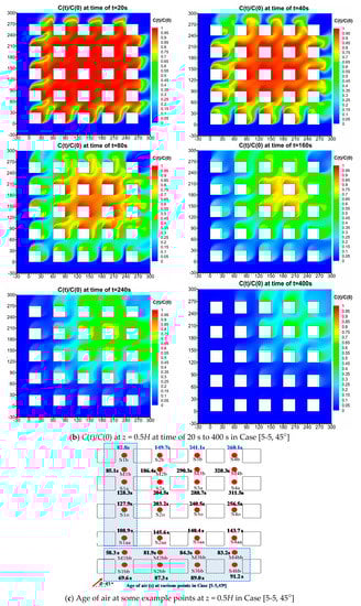 As an example, Figure 6 shows 3D streamline, normalized velocity, C(t)/C(0), and τp at various points in z = 0.5H in Case [5-5, 45°]. Here the velocity is normalized by the freestream velocity at the same height of z = 0.5H. Obviously wind brings clean air into an urban area downstream for pollutant dilution. There are recirculation regions with small wind speed (Figure 6a). Thus, the concentration decay rate (the age of air) is relatively small (large) in downstream regions and recirculation regions (Figure 6b,c).