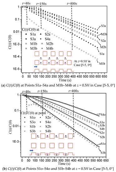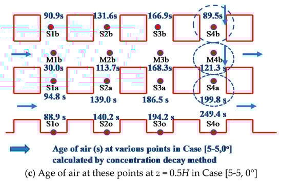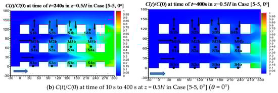 As an example to analyze the concentration decay history related to UCL ventilation, Figure 4 shows 3D streamline, normalized velocity (), normalized lateral velocity () in the plane of z = 0.05H, and normalized concentration (C(t)/C(0)) at a time of 10 s to 400 s in z = 0.5H in Case [5-5, 0°]. Here the velocity and lateral velocity are normalized by the freestream velocity at the same height of z = 0.05H (see Equation (1)), similar to the literature [17,18]. Then Figure 5 displays the concentration history (C(t)/C(0)) and the age of air (τp) at various points in z = 0.5H in Case [5-5, 0°]. In the main streets (Figure 4a), the flow is channeled toward downstream regions. In the secondary streets 3D vortices and helical flows exist in building wake regions. Across the lateral UCL boundary (at y = 135 m), there are lateral helical airflows leaving or re-entering UCL volume. Points with bigger concentration decay rates (K) experience better ventilation, a greater dilution rate, and smaller age of air (τp). Figure 4b and Figure 5a,b show that the ventilation in upstream regions is better than in downstream regions (Figure 5a), and that in the main streets it is better than in the secondary streets (Figure 5a); those (Point S1b–S4b) near the lateral UCL boundary are better than those (Point S1o–S4o) in urban center regions (Figure 5b). Figure 5b displays that K at Point S4b is near to Point S3b, and that at Point S4b near the UCL lateral boundaries it is much bigger than at Point S4o because there is a strong helical inflow across lateral boundaries, bringing in external air to help with pollutant dilution at Point S4b (Figure 4a). Similarly, in Figure 5c, the τp at Points M1b to M4b in the main streets is much smaller than Points S1a to S4a and Points S1o to S4o in the secondary streets. Moreover, air at Points S1b to S4b near lateral UCL boundaries is younger than Points S1o to S4o far from lateral UCL boundaries. More importantly, the τp at Points S4b, S4a, and S4o (89.5 to 249.4 s) verifies that the lateral inflow across UCL lateral boundaries significantly improves the ventilation at Point S4b.