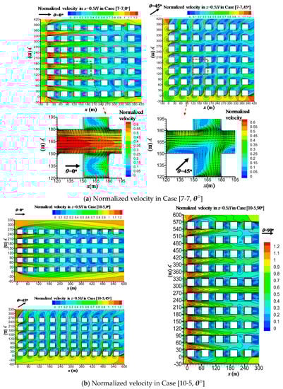 Then Figure 7a,b further displays the normalized velocity in Case [7-7, θ°] (square overall urban form) and Case [10-5, θ°] (rectangular overall urban form) with similar total UCL air volume. Obviously ambient wind directions significantly influence the flow pattern for both overall urban forms (Figure 7a,b). As θ = 0°, there are lateral flows across lateral UCL boundaries. With oblique winds, the flows enter UCL across two sides in upstream regions and leave across the other two toward downstream. The velocity is relatively small in recirculation regions and the presence of street crossings produces considerable momentum and scalar exchange between neighbor streets. In particular, Figure 7a confirms that, for square overall urban form, UCL models with θ = 45° experience more recirculation regions and quicker wind reduction than those with θ = 0°. It is consistent with the literature that building arrays with θ = 45° produce greater flow resistances and worse UCL ventilation performance than θ = 0° [2,7,23,58,59]. Such characteristics with θ = 45° produce adverse effects on its ventilation performance in contrast to θ = 0°.