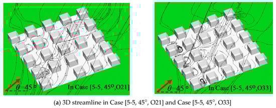 Open space arrangements have been regarded as one possible way to improve UCL ventilation. As shown in Table 1 (Group II), this subsection investigates 24 test cases with six kinds of open space arrangements under four wind directions (θ = 0°, 15°, 30°, 45°). Note that Oij represents the building of position i-j is removed for better ventilation. Figure 8a displays the 3D streamline in two example cases; Figure 8b further summarizes the net ACH by the concentration decay method in all 24 test cases.