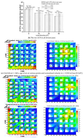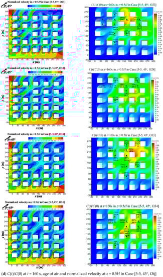 Obviously, with oblique wind (θ = 15°, 30°, 45°) most open space arrangements improve UCL ventilation more than θ = 0° (see Figure 8b). The improvement of UCL ventilation is the best as θ = 45°. Thus θ = 45° is emphasized in the below analysis. Figure 8c,d shows C(t)/C(0) at t = 160 s, age of air (τp) at various points and normalized velocity in z = 0.5H in Case [5-5, 45°] and Case [5-5, 45°, Oij]. Because the open space arrangements act as a kind of ventilation corridor and reduce the total flow resistances induced by buildings, wind speed increases in regions near/surrounding open space and in its downstream regions; subsequently, the concentration decay processes speed up and the ventilation becomes better. The percentage data of τp in Figure 8d refer to the ratio between τp with open space (Case [5-5, 45°, Oij] in Figure 8d) and that without open space (Case [5-5, 45°] in Figure 8c). This percentage at some points can be from 12% to 65%, showing that τp significantly decreases in the regions near these points. Obviously, the effects of open space on flow pattern satisfy the variations of τp (Figure 8c,d) and overall ACH (Figure 8b).