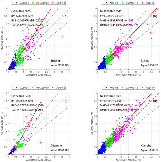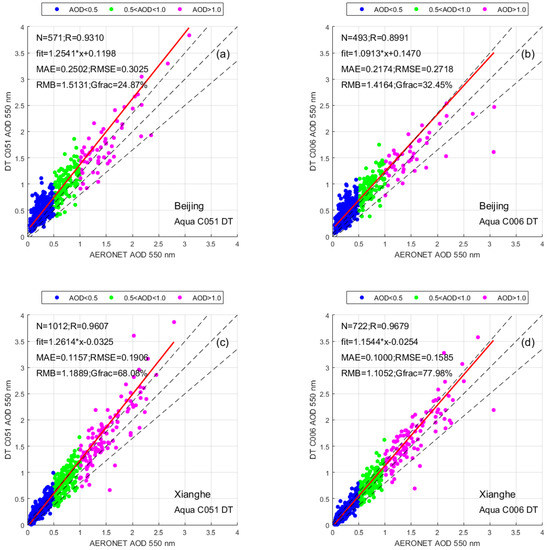Scatterplots between the two collections (C051 and C006) of MODIS DB AODs at 550 nm against the corresponding AERONET retrievals for the two sites (Beijing (a,b) and Xianghe (c,d)) (The red line is the regression line, and the black dashed lines define the envelope of EE; AOD < 0.5: low aerosol loadings; 0.5 < AOD < 1.0: moderate aerosol loadings; AOD > 1.0: high aerosol loadings).