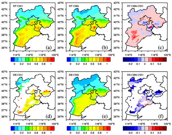 Mean geographical distribution, representative for the period 2006–2015, of the MODIS-Aqua DT (a,b) and DB (d,e) values (QAC = 3), over the Beijing-Tianjin-Hebei region. The absolute differences (C006-C051) for the DT (c) and DB (f) retrieval algorithms are also provided.