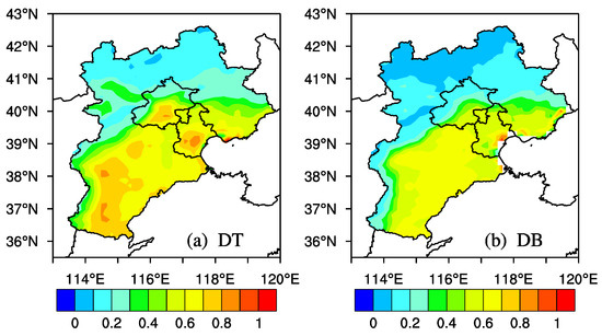 Mean geographical distribution, representative of the period 2006–2015, of the MODIS-Aqua collocated C051 and C006 retrievals DT (a) and DB (b) values (QAC = 3), over the Beijing-Tianjin-Hebei region.