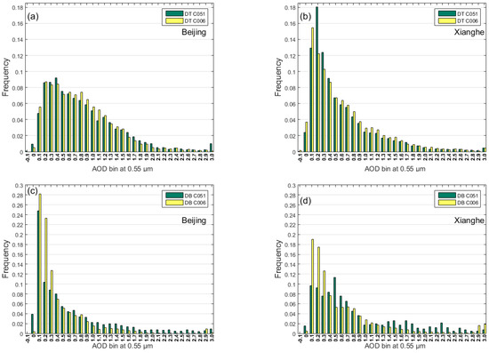 Plotted in Figure 6 are the frequency histograms of the MODIS-Aqua DT and DB (QAC = 3) for both C051 and C006. In order to construct these histograms, we utilized the method proposed by Remer et al. [39] to accumulate the retrieval boxes. In Figure 6a, a wide distribution AOD was found at the Beijing site with an average AOD of 0.83 for DT C051 and 0.79 for DT C006. There was an increased frequency from DT C051 to DT C006 in the range of 0.6–1.5 over the two sites in Figure 6a,b. In particular, it is worth mentioning the increase in high AOD frequency in Levy et al. [12]. Moreover, the distribution from the two collections of DT was unimodal at the Xianghe site and the peak values are near 0.15 in Figure 6b. Additionally, the distribution of the DT retrievals was distinct from the DB retrievals at the two sites. As shown in Figure 6c,d, an evident increase in the range of 0.1–0.3 from the DB C051 to the DB C006 retrievals was noted. For example, the AOD from DB retrievals had a very narrow range (0.1–0.3), with 44% of AOD retrievals for DB C051 and 64% for those of DB C006 falling within the range at the Beijing site.