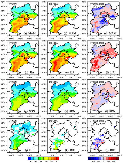 Figure 7 shows the seasonal geographical distribution of MODIS DT C051 and DT C006 and their differences (C006-C051). We used the method in Liu et al. [40] and Sun et al. [24] to divide the four seasons. The geographical distribution of MODIS DT AOD in four seasons showed similar patterns with multi-year average spatial distribution described in Section 4.3. The AOD showed evident seasonal variation from the first two columns of Figure 7, which exhibited AOD values that were higher in spring and summer and lower in autumn and winter [24]. As shown in Figure 7d,e, summer had the highest AOD (0.6605 for C006 and 0.6147 for C051) because the increase in temperature and humidity increased the condensation nuclei over the Beijing-Tianjin-Hebei region [24,41]. Furthermore, this region frequently suffers from severe sand dust weather in spring, which increases the AOD. In fall and winter, rainfall and snowfall reduce the particulates suspended in the air and decrease the AOD.